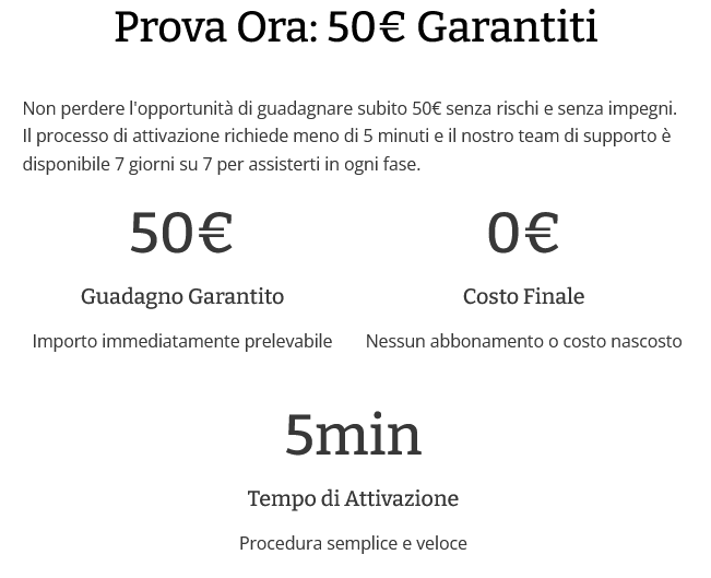 Ti sei mai chiesto se sia possibile guadagnare online in modo sicuro e prevedibile? La nostra sfida è farti ottenere 50€ garantiti senza spendere un centesimo, dimostrando che il nostro sistema funziona davvero.
